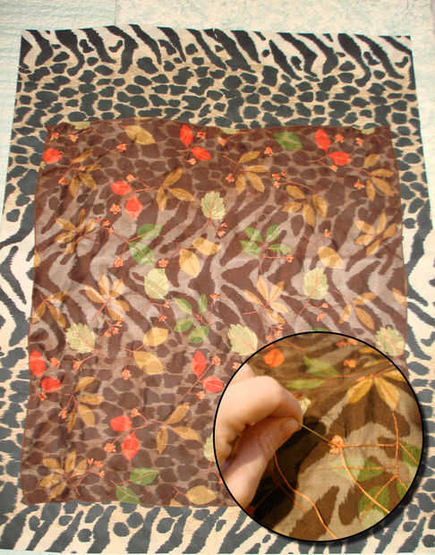Trabajar en una gran superficie plana. Sentar hacia fuera la tela de fondo, todo será cosido, pegado y atado a esta tela. Asegúrese de que no hay arrugas, hierro si es necesario. Usé una almohada animal impresión como por la tela de fondo. Im agregar este marrón ve a través de la bufanda, para darle un efecto fresco con la muestra de impresión animal a través de la bufanda. Ya que la bufanda es una tela muy pura y puede ser difícil de coser sin estirar y fruncir. La coloqué en mi tela de fondo suaviza cualquier arruga y usando pegamento de tela con tachuelas abajo de las esquinas y el centro de cada lado. Cosí unas puntadas en las flores bordadas en la bufanda con un color muy similar de hilo; Esto es sólo para mantener el centro de la bufanda cerca de la tela de fondo.