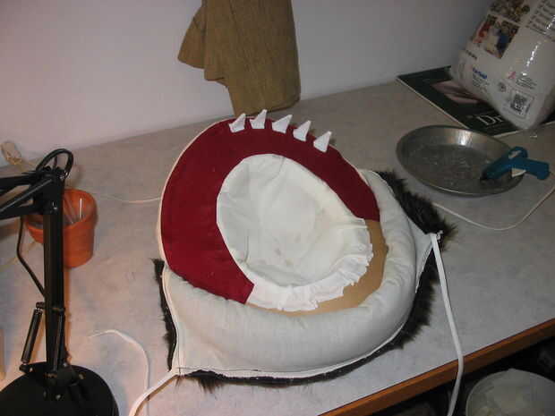 Para los dientes, tomé una tira de fieltro blanco que era cerca de 3 por 12 pulgadas y pegado por la mitad longitudinalmente, con sin cola a lo largo de una media pulgada del borde doblado no. Cuando se seca, cortar cuñas de la tira para los dientes