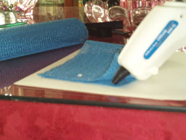 El estante-trazador de líneas de goma es muy porosa, por lo que tienes que tener mucho cuidado de pegar las dos piezas. También, el caucho de la línea sí mismo tiende a derretir un poco del calor de la pistola encoladora. Con mucho cuidado poner pequeñas gotas de pegamento alrededor del borde del outter de dos pastillas para que se peguen juntos como una almohadilla de pie solo. Esto les dará mucha más amortiguación entonces si se utiliza como una sola capa. Ver sus dedos como se pegan las piezas como algunas del pegamento caliente se filtran a través de las almohadillas. Tenga cuidado de no pegar las almohadillas a su mesa de trabajo.