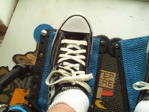 Como estaba reemplazando simplemente ruedas existentes en mi reposapiés, el reposapiés ya tenía los agujeros pretaladrados. Si esto no es el caso con su silla de ruedas, necesita perforar dos agujeros, uno en la esquina derecha de la estribera derecha y uno en la esquina izquierda de la estribera izquierda. Este agujero debe estar cerca del borde, pero no debe comprometer la integridad estructural de la estribera. Asegúrese de comprobar con la garantía de su silla de ruedas antes de hacer cualquier modificación permanente.