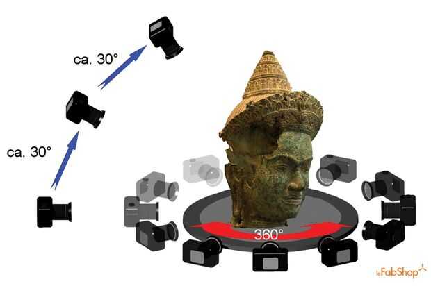 -Por lo menos dos completo 360 ° gira para fotografías, uno en 90 ° desde la parte delantera y uno en levemente sobre 120 ° (ver diagrama anterior). Un número óptimo para la creación de una malla exacta es alrededor de 150-200 fotos.