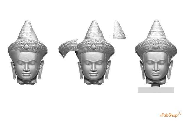 Usando enmascarar de Zbrush y polygrouping herramientas, hemos obtenido el sobrevivir todavía y piezas de calidad mejor del modelo y pegándolas de nuevo en parche los agujeros. Un poco de resculpting se hizo después con el fin de mezclar las costuras con el modelo y recrear detalles perdidos en muchas partes de la cabeza como las orejas y algunas partes de la coiffe.