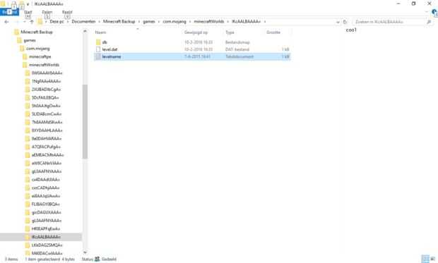 Dentro de la [carpeta del mundo] es un archivo llamado "levelname.txt". Este archivo contiene el nombre del mundo. Cambiar este archivo no modifica el nombre dentro del juego. Abrir el archivo "level.dat" revela otra entrada levelname (hexadecimal):