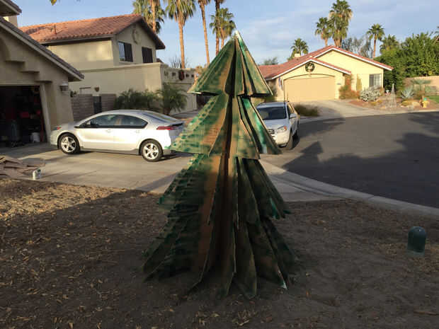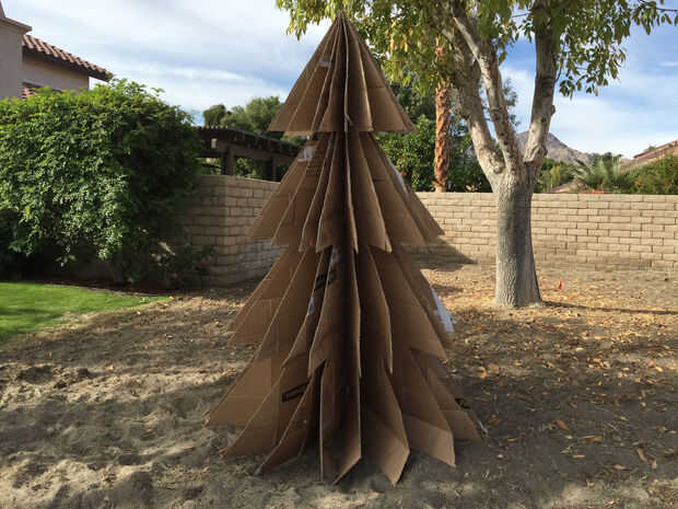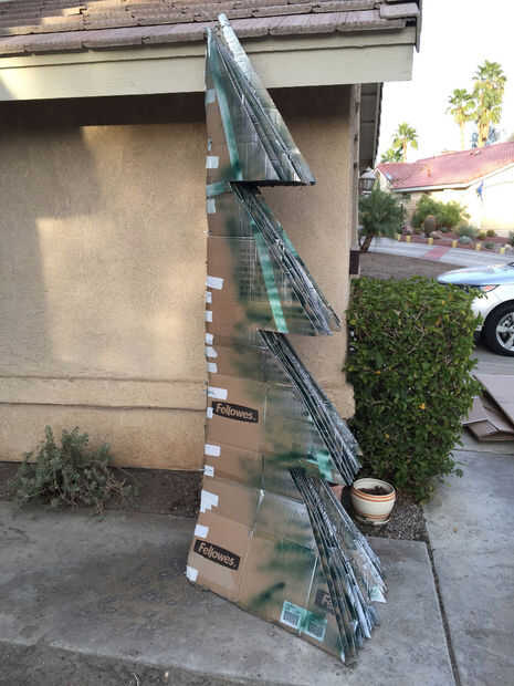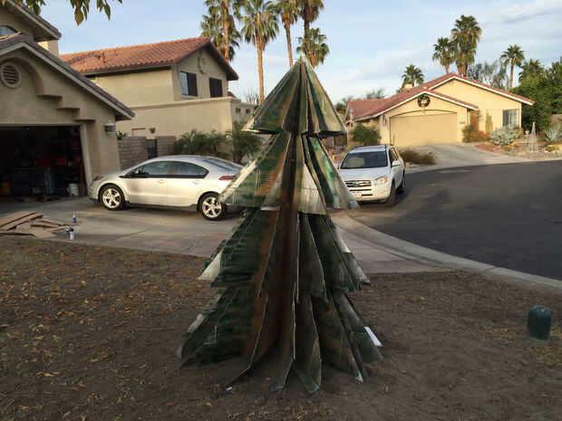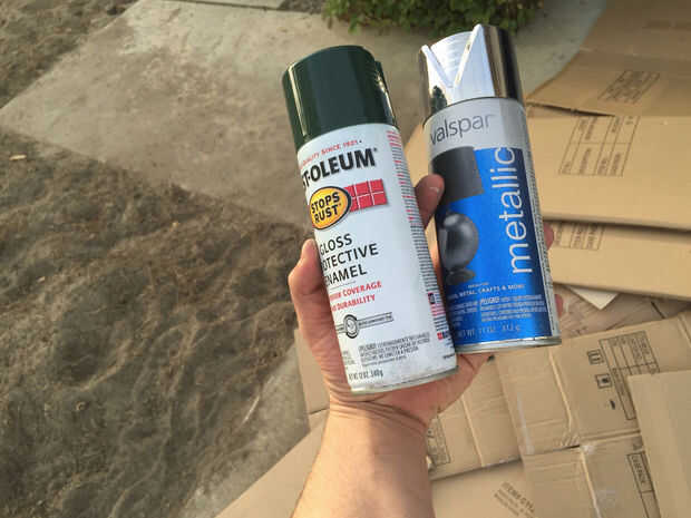 Tenía una lata de pintura en aerosol verde bosque y uno de plata metálica. No mucho. Así que básicamente sólo empañan las áreas externas de cada capa para que sorta kinda sería un árbol de hoja perenne con algo de nieve ligera en las puntas.