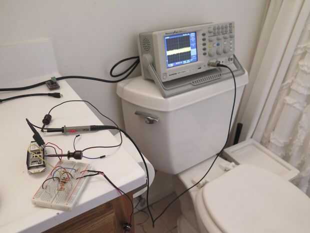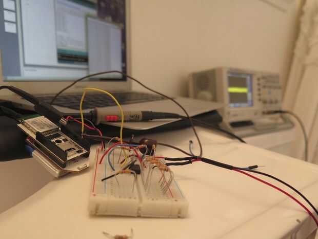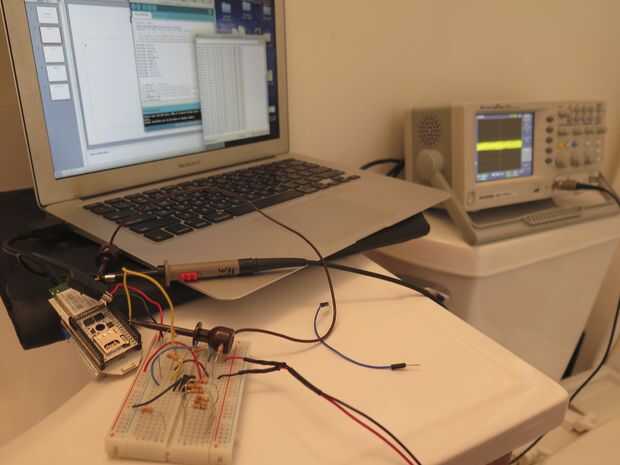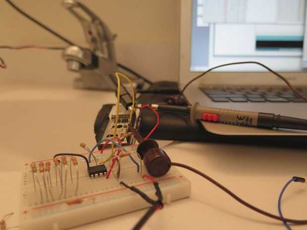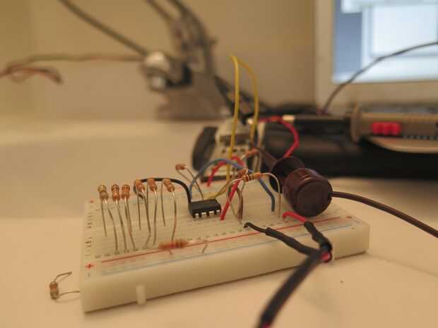 ¿Por qué no simplemente funciona?! Estaba en un lugar muy oscuro hasta que llegué a través Instructable de Amanda sobre el uso del osciloscopio. Llegó el momento de depurar mi circuito. Tomé el osciloscopio casero conmigo y rápidamente descubrió lo que estaba mal. Esto fue probado fácilmente por la tensión en varios puntos de sondeo y asegurándose de que el circuito se comportó como yo quería que. También se llevó a casa un montón de resistencias de diferentes valores e intercambiar hacia fuera para verificar que el circuito me estaba dando la amplificación óptima.