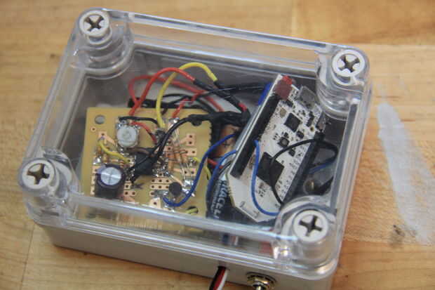Una vez que resuelve los problemas de tensión de suministro, es tiempo para cerrar el circuito. Compré una caja de caja impermeable $10 de Adafruit y poner el circuito interior. Me aseguré de darlo un interruptor externo para el circuito del sensor, y una rápida desconecte el sensor de efecto hall. Todo perfectamente ubicado dentro.