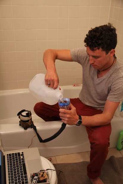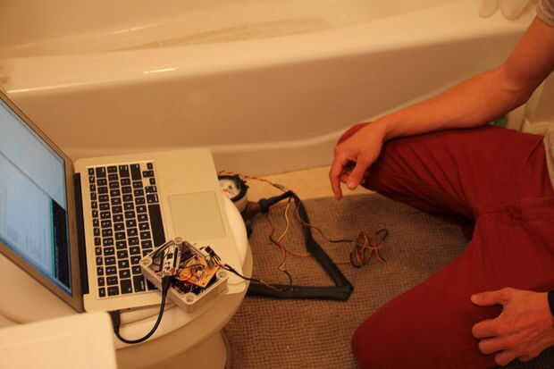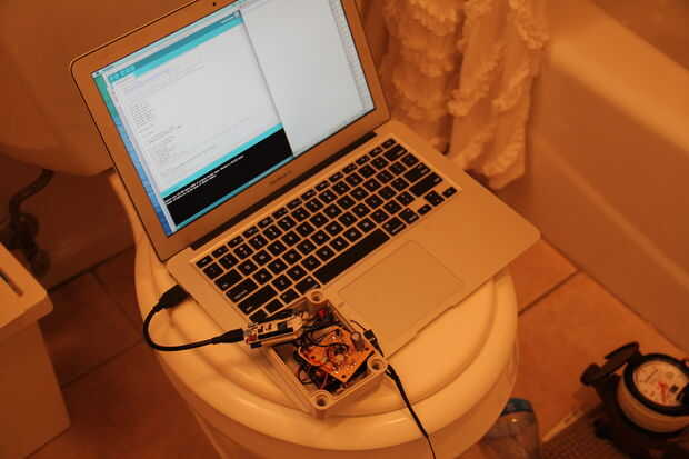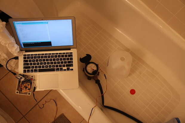 Una vez tuve un circuito robusto sensor conectado en el Pinoccio Scout y darme lo que necesitaba, llegó el momento de calibrar el dispositivo. Tuve la cañería de agua independiente, he conectado un embudo casero con un tubo de bicicleta y vierte de un galón a través de. La T-10 Neptuno (5/8 en) metro me dio 60 pulsos por galón. Una vez usted figura en el código, le dará las medidas exactas de tu flujo.
