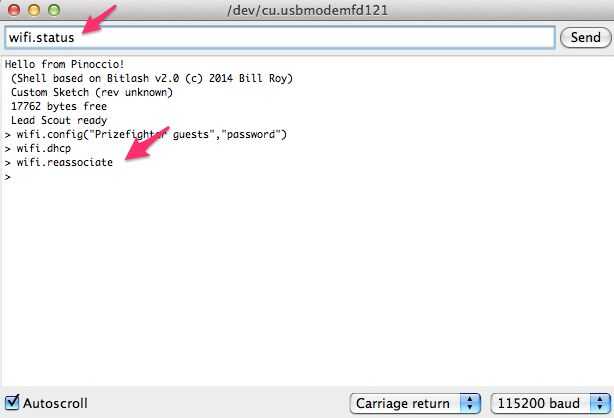 Una nota importante en Pinoccio y Wifi: Nos dimos cuenta durante la prueba que Pinoccio no puede manejar las conexiones wifi que requieren algo más que el par de contraseña de red estándar. Por ejemplo, un Starbucks que requiere una casilla de verificación de autorización web, no funciona con el plomo de Scout.
