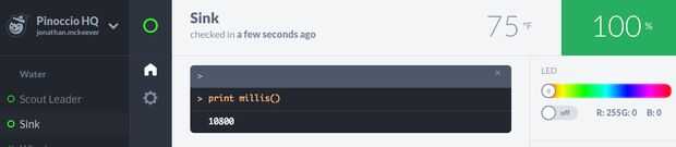 También observe que hay un campo de entrada de texto. Esto le permite cargar ScoutScript comandos directamente en el explorador. Introduce "imprimir millis()" en ese campo y presiona enter. Un número (que indica que debe mostrar el número de milisegundos desde el módulo fue pasado encendido).