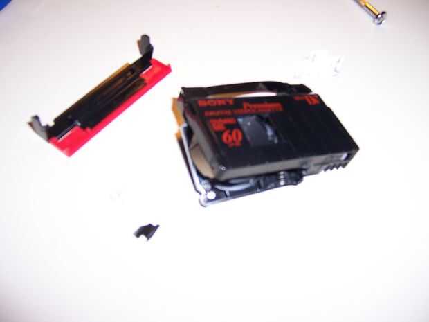 En este caso en particular, la cinta no tenía tornillos para remover y fichas o pegada. Cuidadosamente rompí la carcasa aparte teniendo especial cuidado de no causar daño a la cinta a través de las arrugas, crinking, estiramiento, meter, manipulación u otra manera tocar el carrete. En este punto en la segunda foto he podido sacar la parte izquierda de la bobina. Con la mitad de la cinta quitada, la otra mitad fue un poco más fácil. Cuando el carrete se quita totalmente, sugiero enrollar la cinta en el carrete de izquierda (así completamente rebobinar la cinta).