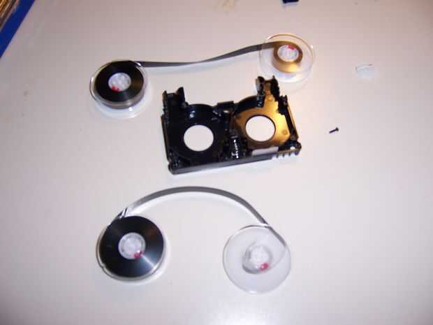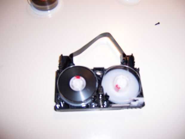 Cuidadosamente retirar los mismo cuatro tornillos pequeños en la parte trasera, coloque la cinta sobre el área de trabajo y quite la cubierta superior para exponer el carrete en su cinta de donantes. Hay unos que son muy difíciles de colocar correctamente en posición, así que tenga cuidado de quitar el carrete de donantes de la carcasa de la cinta sin molestar a estos. Añadir una pequeña cantidad de holgura extra y su cinta recuperado en el nuevo caso. Una vez correctamente en su lugar, viento a la holgura con la mano. Coloque la tapa en la parte superior y atornille la cubierta en lugar.