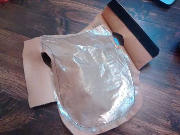 Luego coser las piezas de plástico (las dos piezas juntas como uno), a la tela.