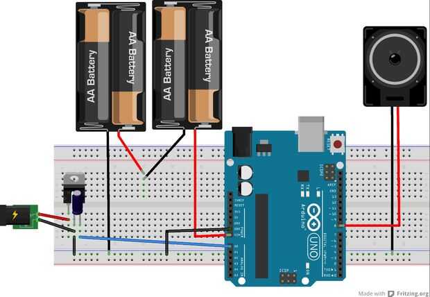 2) los motivos de todo están conectados. Incluye la negativa de la batería, la tierra del regulador, la tierra del Arduino y un cable de altavoz.