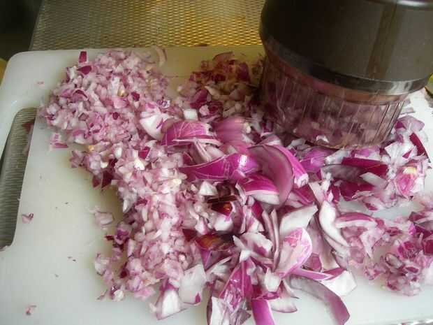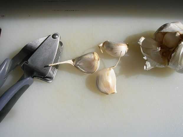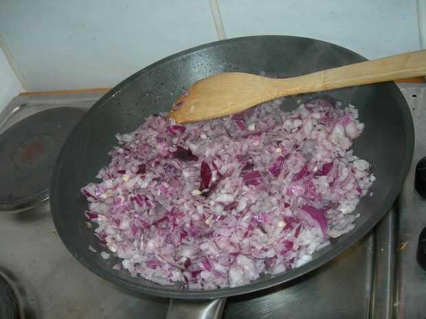 Una vez que esté caliente, añadir la cebolla. Pele y presione tres dientes de ajo sobre ellas. Deje que todo hierva suavemente a fuego lento, no dejar la cebolla dar vuelta a marrón, que las amargas. Solo que haz suave, dulce y mirando algo vidrioso. Esto le llevará unos diez minutos.