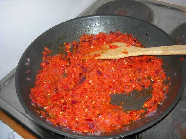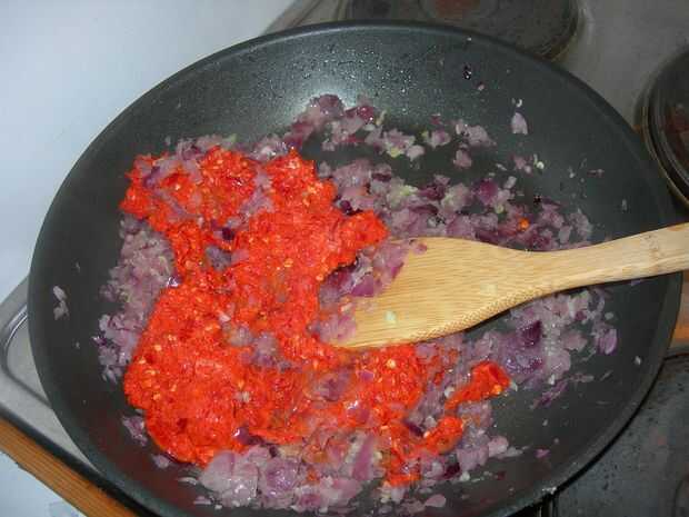 Una vez el pimiento todo picado o molido encima, añadir a la cebolla y revuelva. Tenga cuidado, que usted puede notar que la capsaicina en el aire es suficiente para hacer los ojos quema y la nariz mocosa!