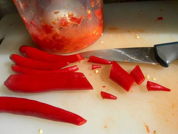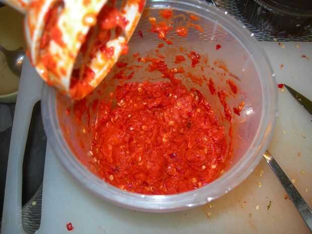 Mientras están hirviendo las cebollas, cortar el pimiento. También deben ser finamente picados; Usé una batidora de inmersión. Echar un chorrito de aceite de girasol para hacer una pasta o líquido, escamas de la pimienta no dry-ish.