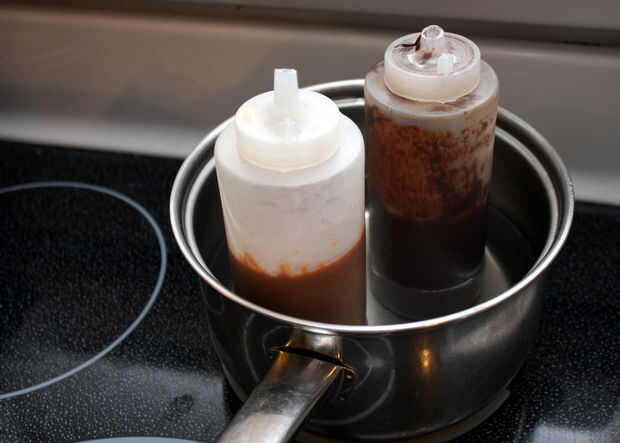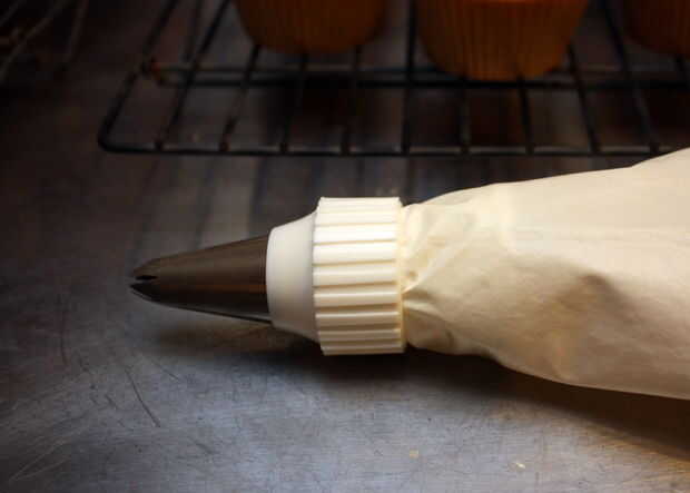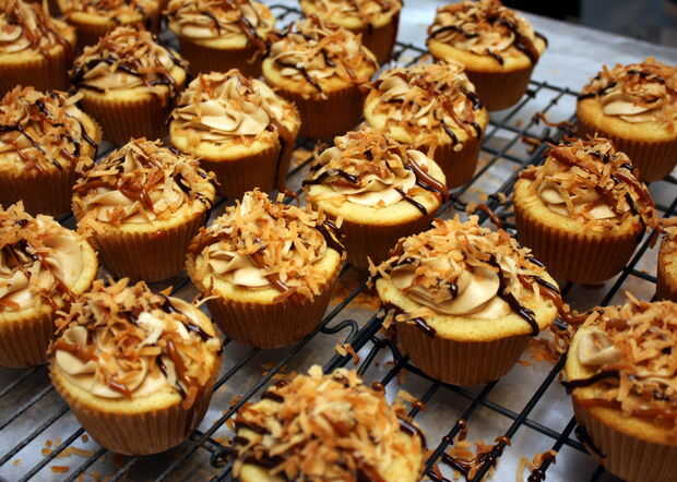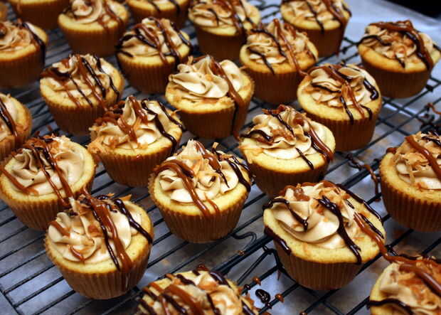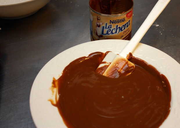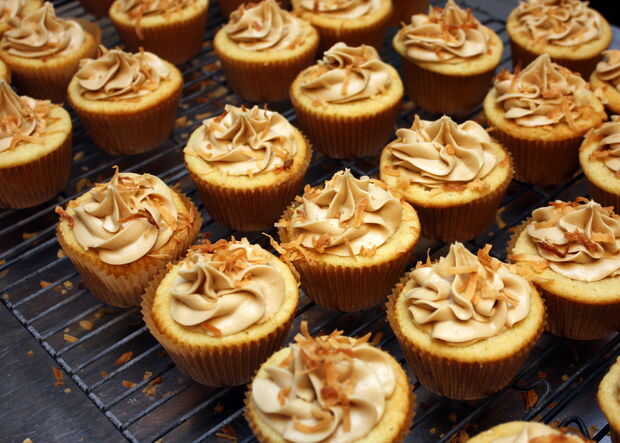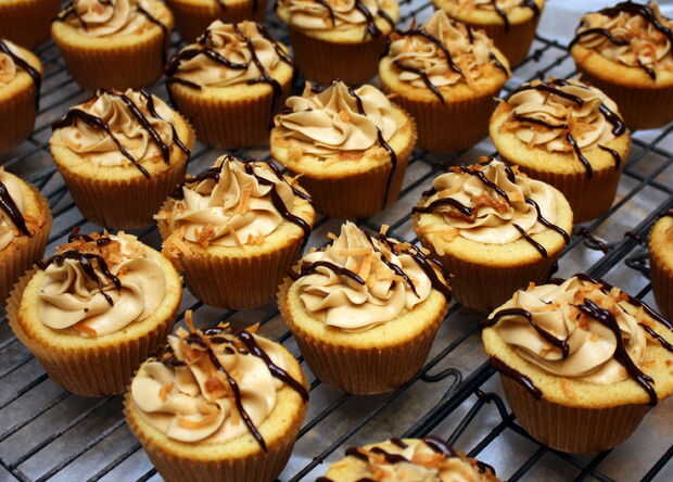 Lugar papel encerado debajo de sus refrigeración racks (me lo agradecerá más adelante). Si tiene una punta y una bolsa de hielo, poner un remolino sobre cada cupcake. Si no, poner una cucharada generosa con un cuchillo de mantequilla o instrumento similar. Permiten el glaseado un poco mientras trabajamos en el dulce de leche. Podría ser muy ambiciosos y hacer un caramelo para el relleno pero dulce de leche es muy buena y muy fácil. Abrir la lata y vaciar en un recipiente adecuado para microondas y zap hasta que es agradable y secreción (tratar de 2-3 minutos al 50%). Transferir cuidadosamente su tubería caliente dulce de leche a una botella del apretón, otra vez un embudo puede ser útil aquí. El glaseado puede necesitar un poco más de tiempo, así que la ganache y dulce de leche pasar el rato en un baño de agua caliente hasta que se necesitan. Cuando estés listo para el relleno, espolvorear coco tostado sobre sus magdalenas. Ahora toma el chocolate y dulce de leche y apretar rayas sobre la capa de coco. Superior de las capas con más tostadas de coco. Enhorabuena, estás acabado!