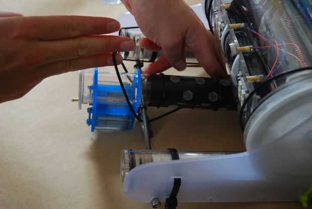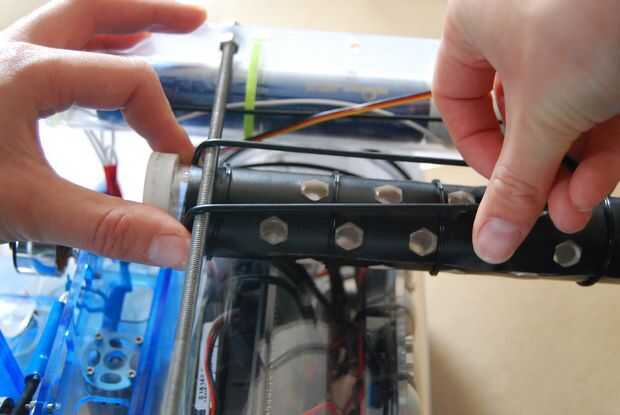 Todo lo que queda es conectar el remolque de plancton para su OpenROV. para hacer esto uso la goma grande junta tórica primero coloque la junta tórica sobre el anillo posterior del chasis del servo y alimentar en la varilla roscada en el ROV. Conecte el otro extremo de la junta tórica en la parte superior de la tapa del extremo. La tensión de la Junta protegerá el remolque de plancton firmemente para colección.