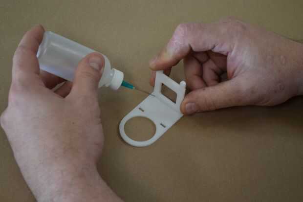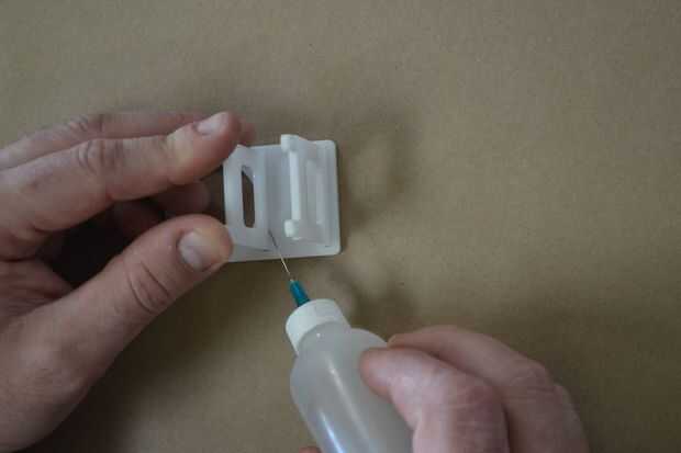 - Aplique cuidadosamente una fina tira de solvente en la unión entre las piezas de acrílico.