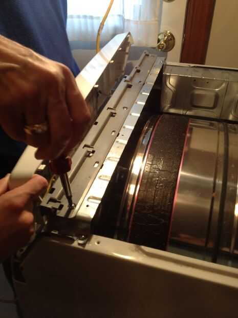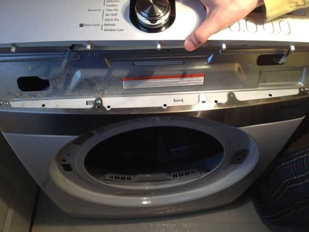 Quite los tornillos de la pieza de adorno superior que va a lo largo de todo el ancho de la secadora. Levante el panel de control a la parte superior y el resto en la parte superior de la secadora.