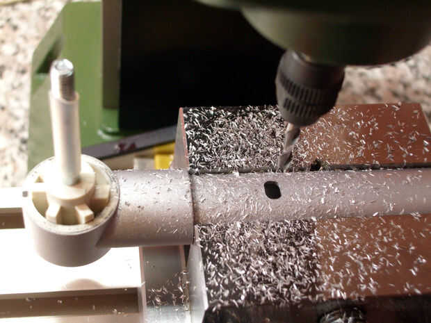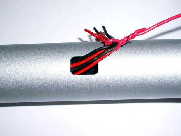 Deben hacerse tres nuevas aperturas. Uno en el tubo central, ligeramente por debajo de la articulación, otro en la barra que contiene la red de cableado, ligeramente por encima de la articulación y por último una abertura cerca del punto donde se monta la lámpara LED.