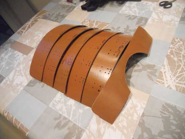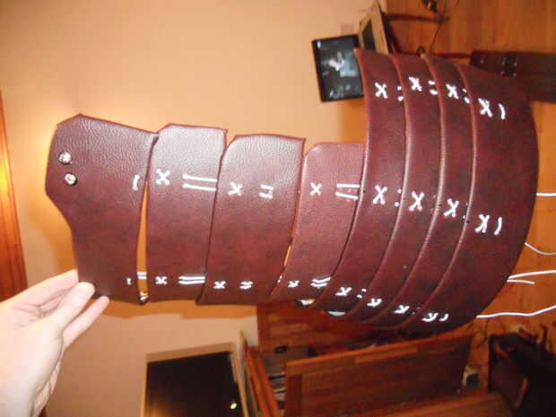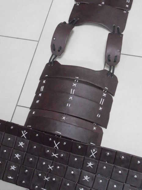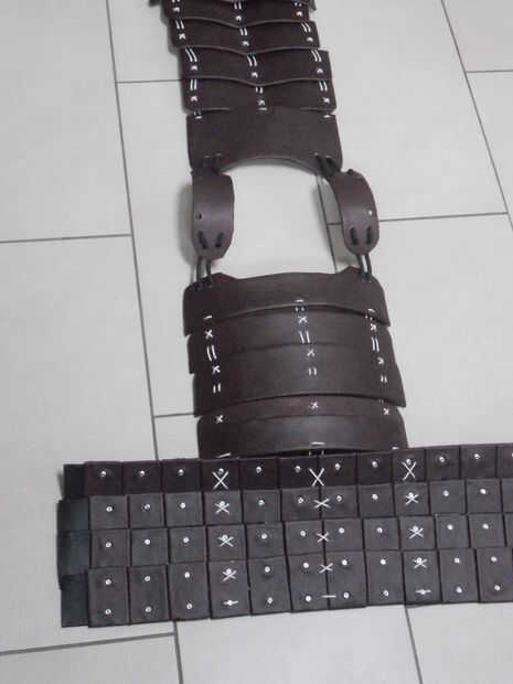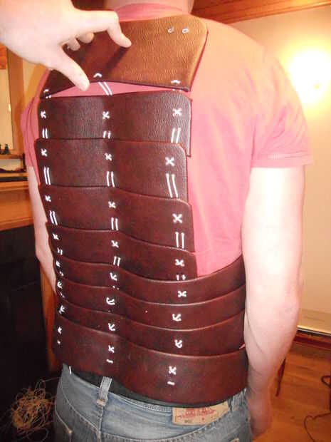 El estómago se hace de 48 pequeños paneles que luego se cubren en cuero y rivited en una correa de cuero. Hay 16 paneles en cada correa y cuando unieron utilicé la cuerda extra la pechera para enganchar las correas en el pecho. la pieza posterior era igual que el pecho pero la mitad camino hacia abajo la espalda las piezas consigue más de largo y fuerte abrazo alrededor de su cintura. Los pedazos más largos deben tener dos agujeros en cada esquina para permitir que la parte delantera del estómago fijar juntos utilizando un trozo de cuerda.