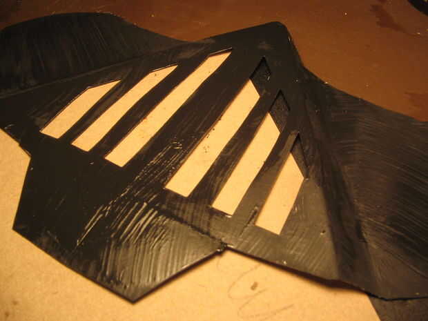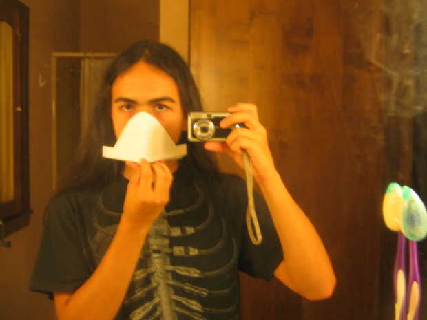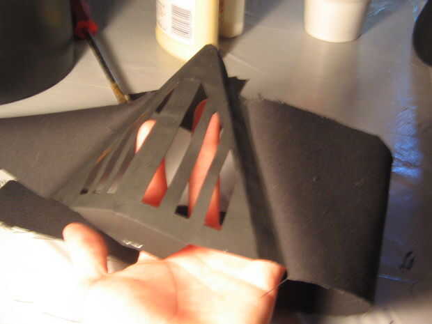 En primer lugar algunos cartulina y cortar un diseño que fuera de él, hice 2 antes de que elegí uno. Luego cortar ranuras en las que le dan ese aspecto de Vader y había pintada de negro y claro lo cubrió así conservarían algunos de forma. He añadido algunos palitos en la parte trasera de apoyo también. Coloque algo de tela a los lados y dejar tiempo suficiente para envolver alrededor de su cabeza y atar en la espalda. Yo con grapas a algunas tela de lazo dentro de la máscara así que personas no ver mis labios y la nariz por debajo pero no tienes que, o usted puede usar una máscara de esquí por debajo de ella.