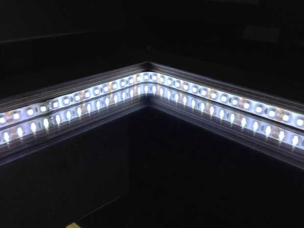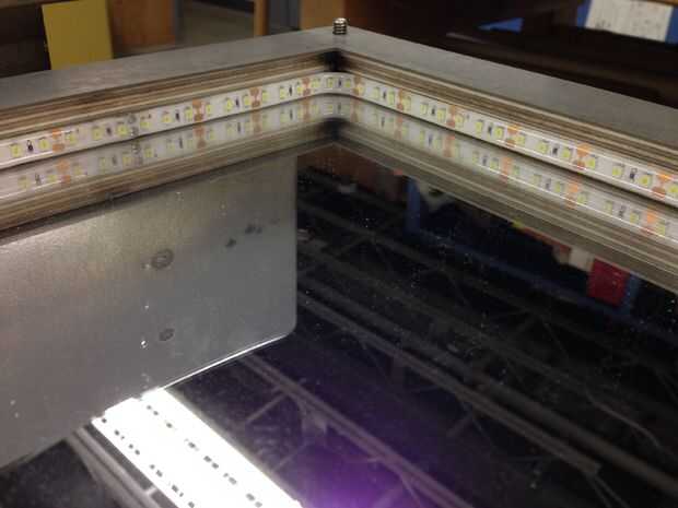Durante la reunión, el último paso era añadir las luces LED. Cada capa fue ranurada a través de una varilla metálica roscada para sujetar en su lugar. En el fondo, puse el convertidor de corriente para las luces y corrió el cable por un agujero en una pared interior. Las luces LED se encuentran en el centro para iluminar las diapositivas mapa debajo de la topografía 3D impresa. He utilizado una superficie espejada de Plexiglas en la parte inferior y difuso de Plexiglas en la parte superior para crear una iluminación uniforme.