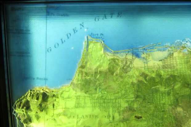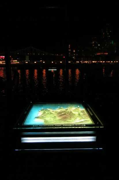 La topografía 3D impresa de San Francisco realmente cobra vida en la noche cuando los mapas a continuación parecen están siendo proyectadas en la superficie. Mientras se trazado a mano la línea de Costa, uno podía mirar por la ventana del muelle 9 ver waterfront de la ciudad real en todos los de gloria. Los mapas son grandes!