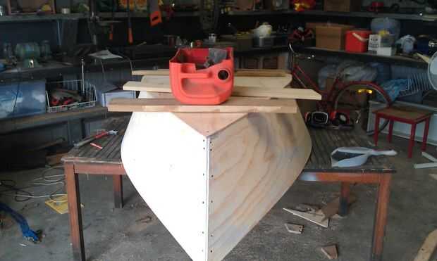 Dé vuelta el barco y llenar la pieza inferior grandes ligeramente en posición. Pesan con tablones y algo pesado. Luego sujetarlo con tornillos pequeños.