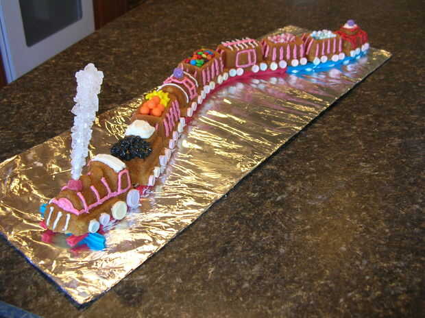 Utilizamos el Williams-Sonoma "Pan de pastel de tren" para construir la torta sí mismo y una variedad de dulces para hacer la decoración.