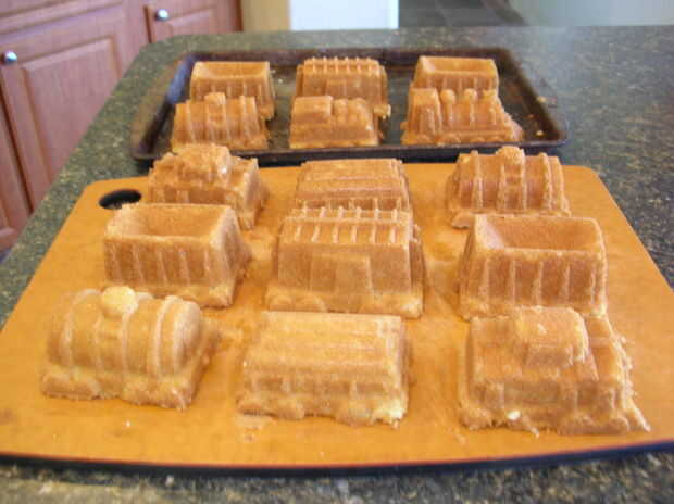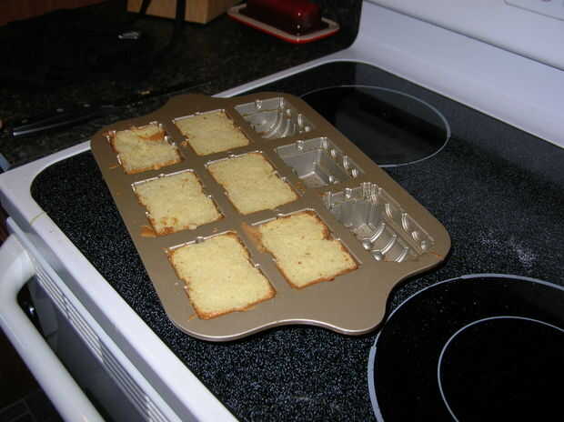 Una vez hecho el pastel, usted encontrará que los coches tienen una cúpula en la parte superior (realmente la parte inferior) que haría difícil a los mismos. Sólo tomó un cuchillo y les había aserrado apagado, al ras con la parte superior del pan, para que las tapas (fondos cuando invertido) sea planas.