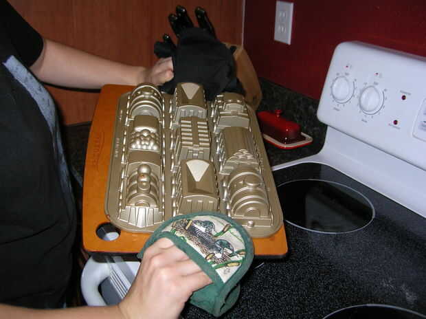 Luego, coloque un elemento de cocina grande, plana y rígida de cualquier naturaleza (tabla de cortar, galletas, cualquiera que sea) en la parte superior del molde para pasteles. Con mucho cuidado invierta el molde para pasteles - Voila! Sus vagones son lado derecho para arriba.