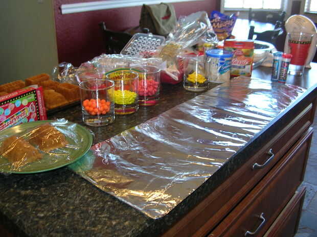 Tome un pedazo de cartón en cualquier tamaño y forma que te gusta y cubrir con papel de aluminio. La primera vez que hice esta tarta hice una ronda - así que la pista era un círculo - y pensé que parecía divertido, así que tomamos el tren del amor más de una forma de sinuosos pista. Mucho más estéticamente atractivo.