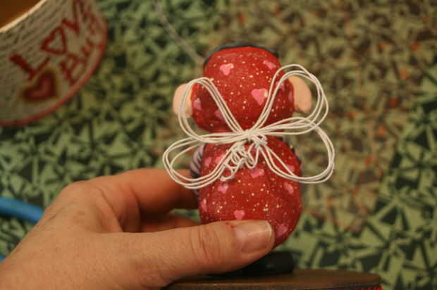 La antena se hace envolver una longitud de alambre alrededor de un pincel, y luego estirar hacia fuera para aflojar el rizo. El cable entre dos etiquetas engomadas del corazón del emparedado y usando el pegamento E6000 a la cabeza.