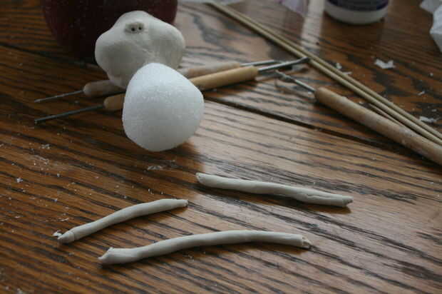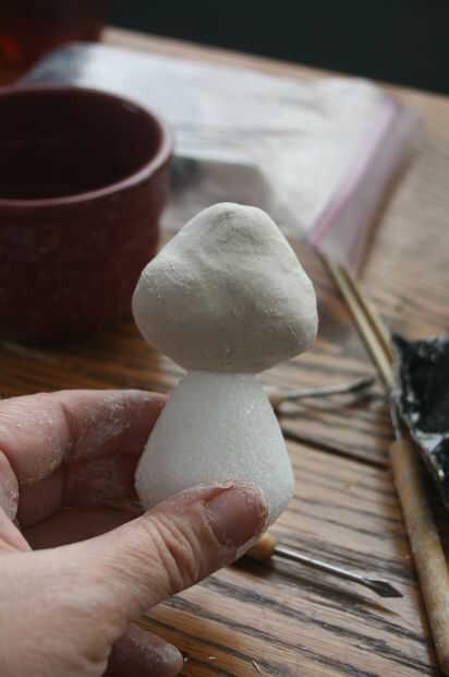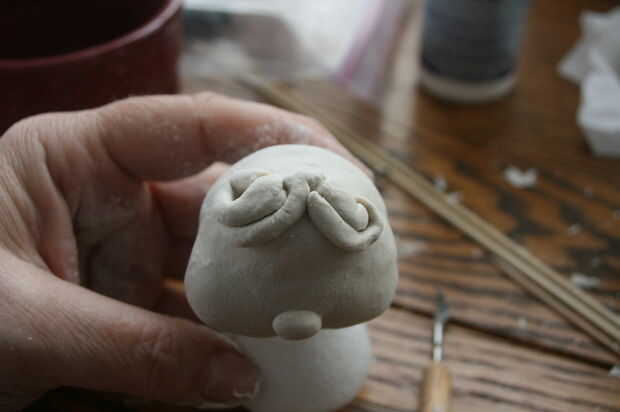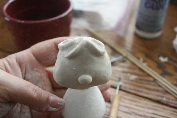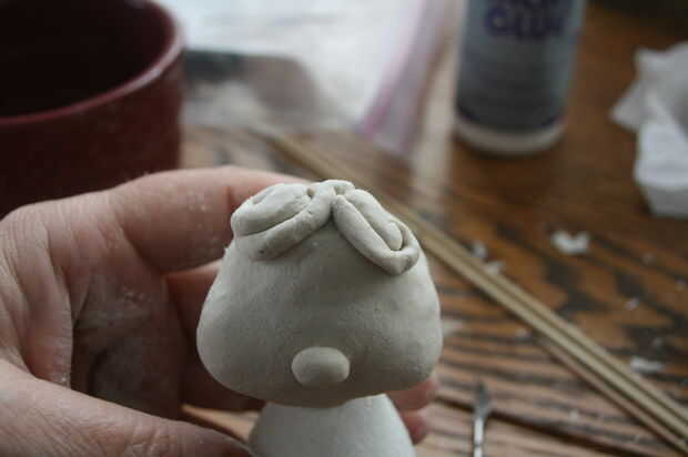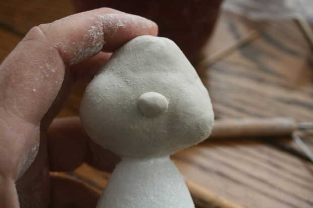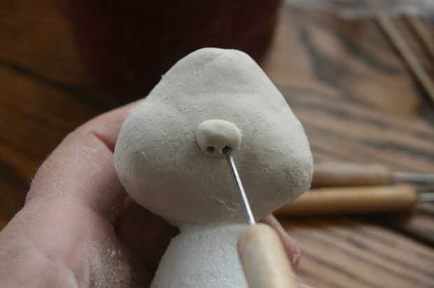 Coloque la nariz y bobinas en el smoosh cabeza y alisa y molde para la cabeza. Haciendo dos orificios nasales con una herramienta afilada o un palillo de dientes.