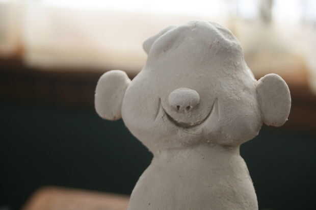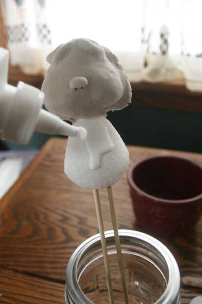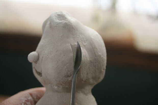 4 º aplanar y dar forma las orejas entre los dedos, luego con una herramienta o un palillo que una porción pequeña en la cabeza donde desea colocar los oídos y auriculares a la cabeza del molde.