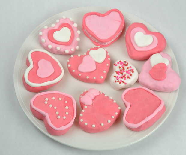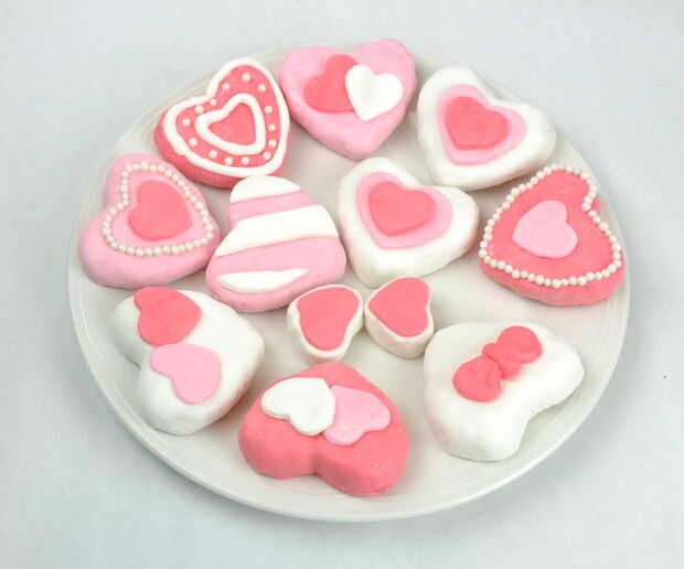 En la segunda foto se pueden ver dos corazones donde hice un color en la parte superior y uno en el lado. Si decides hacerlo, corte un corazón de fondant que es del mismo tamaño que el corazón de Krispies de arroz. Lugar que en la parte superior y luego rodar hacia fuera algún otro color del fondant. Utiliza un cortador de pizza y acabo de cortar un rectángulo de largo y envuelve el lado del corazón.