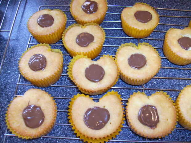 Después se hornean los cupcakes, y mientras estén todavía caliente empuje un beso de chocolate punto lado abajo primero en el centro de cada Magdalena.