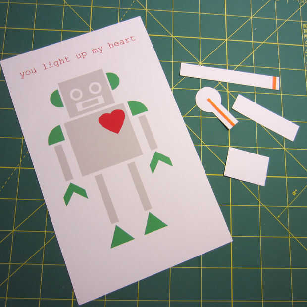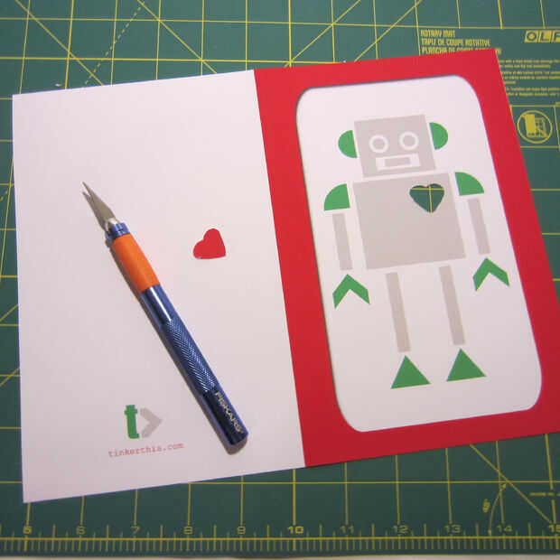 1. En la hoja frontal, use un cuchillo x-acto para recortar el corazón en el robot