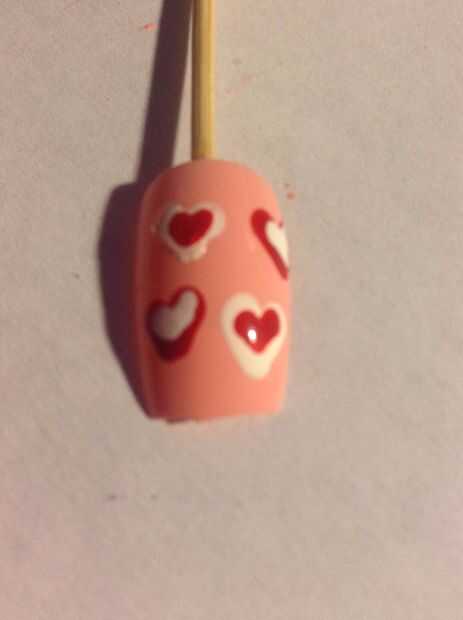 Dibujar corazones blancos y rojos grandes en tu uña con un instrumento punteado. Deje seco y corazones más pequeños de pintura del color opuesto dentro de los corazones grandes. Vea el video para aprender a hacer corazones!