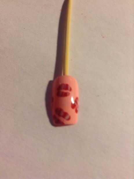 Usando la herramienta puntea, dibujar unos labios rojos en su clavo. Una vez seco, realizar algunas pequeñas líneas con un pincel fino con su base color rosa. Mira el video para ver cómo!