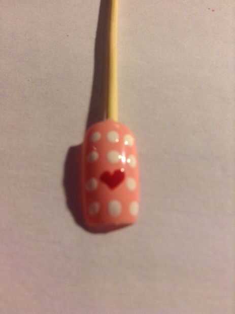 Usando un instrumento punteado, hacer hileras de pequeños puntos blancos en toda la uña. Saltar un punto en el centro de una fila y reemplazarlo con un pequeño corazón rojo. Vea el video para ver cómo hacerlo!