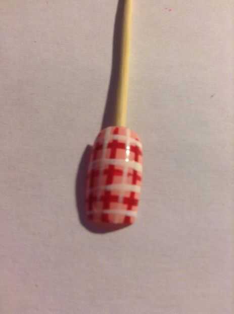 Empezar haciendo 3 líneas verticales rojas, 3 líneas horizontales rojas. Deje que se seque luego pintura 2 líneas blancas verticales entre los rojos y 3 ó 4 líneas horizontales blancas. Vea el video para ver cómo hacerlo!