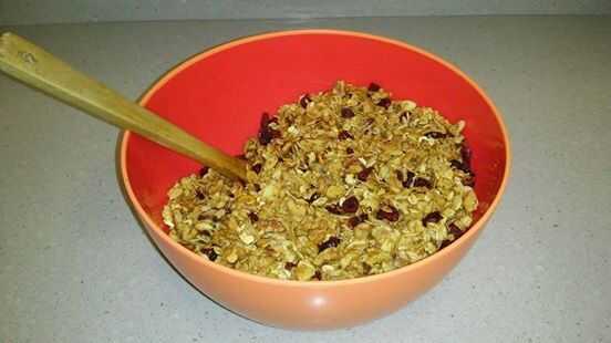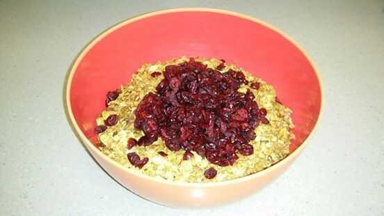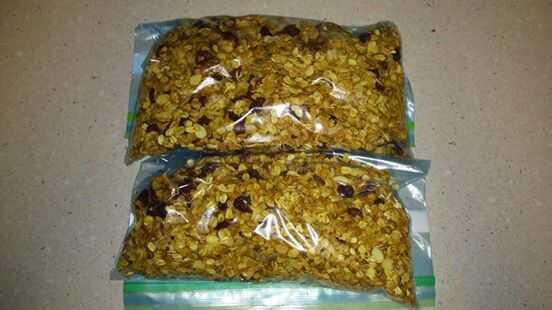 Cuando se haya enfriado la mezcla de avena y nueces, agregue los arándanos secos o pasas. Mezclar bien y colocar en bolsas de almacenamiento de alimentos o frascos para conservas. Mi receta hace 2 cuartos de galón. Almacenar en lugar fresco y seco.