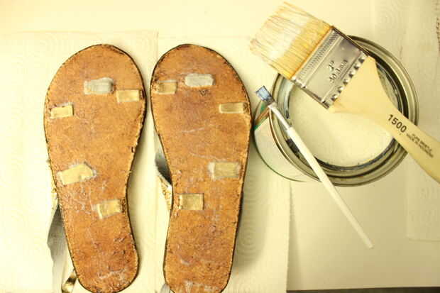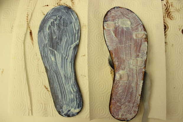 Para fijar el cuero de la suela superior a las suelas de goma inferior comencé aplicando una capa base de cemento de contacto en ambas superficies y permitir el pegamento a pegajoso durante 15 minutos.