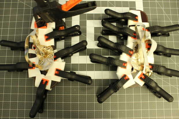 Después el pegamento pegajoso apliqué otra capa de cemento de contacto en ambas superficies y e intercala utilizando abrazaderas. (Un montón de pinzas!) He utilizado pedazos de desecho de vinilo para proteger el calzado de conseguir dañado por las pinzas, no quería que ninguna marca de desgaste en la suela de cuero. Me permite los zapatos a secar durante la noche para asegurarse de que todo era seguro y firmemente conectados.
