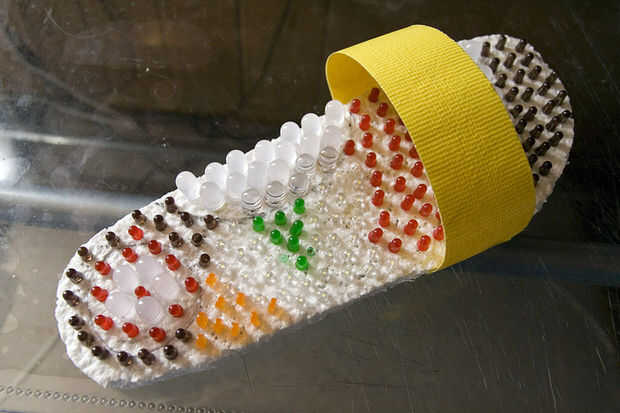 Stick a un lado de la cinta al borde y parte inferior de la planta del pie y coloque el pie. Envuelva la cinta alrededor de la planta del pie y el pie, para ajustar la longitud y pegarlo a la suela también. Esta acción requiere por lo menos dos manos y se ve un poco torpe, así que no hay ninguna foto del proceso, lo siento... Ahora tu sandalia geek está lista y puede empezar a recoger los LEDs para el otro pie.