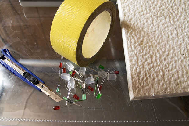 Todo lo que necesitas para las sandalias de geek LED es alguna espuma de poliestireno, un cortador, pinzas, cinta aislante y un montón de LEDs muertos