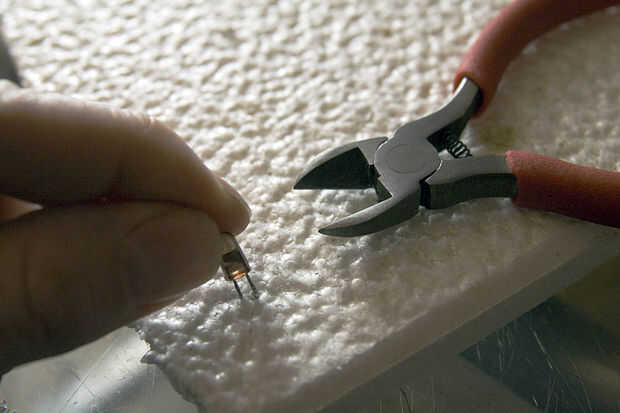 Corte las patas de los LEDs con las pinzas. Deben ser lo suficientemente largos para ser pegado firmemente en la espuma de poliestireno, pero suficientemente corto para no sobresalen de la parte inferior. Entonces empezar a colocarlos. Y seguir colocándolos...